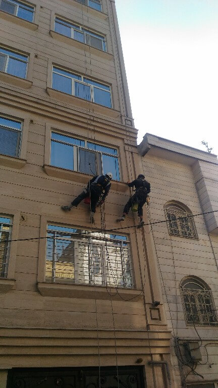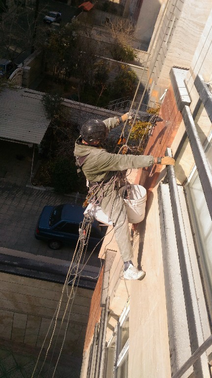 رنگ آمیزی نمای ساختمان در تهران با طناب | رنگ آمیزی نما و پاسیو بدون داربست